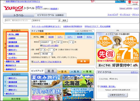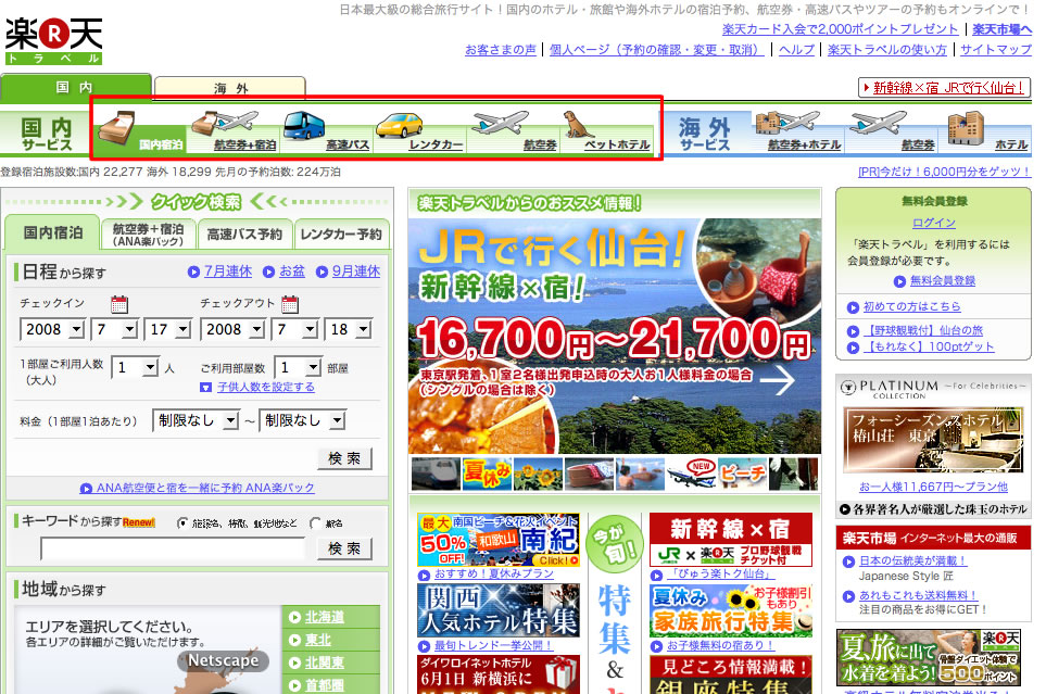 またYahoo!トラベルのナビゲーションにおいて、「航空券付きのツアーを選びたいが、どこを押したらいいのかすぐに分からなかった」というコメントが聞かれました。「国内航空券」「航空券+宿泊」「国内ツアー」など似たような文言がいくつもナビゲーションに並ぶと、ユーザーは直感的な判断が難しくなります。例えば、楽天トラベルのように文言の横にアイコンをつけることで、分かりにくさを軽減できます。