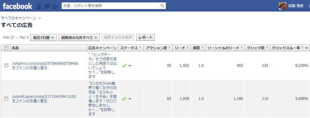 Facebookの広告キャンペーンがログイン画面から成果が見られるようになりました。